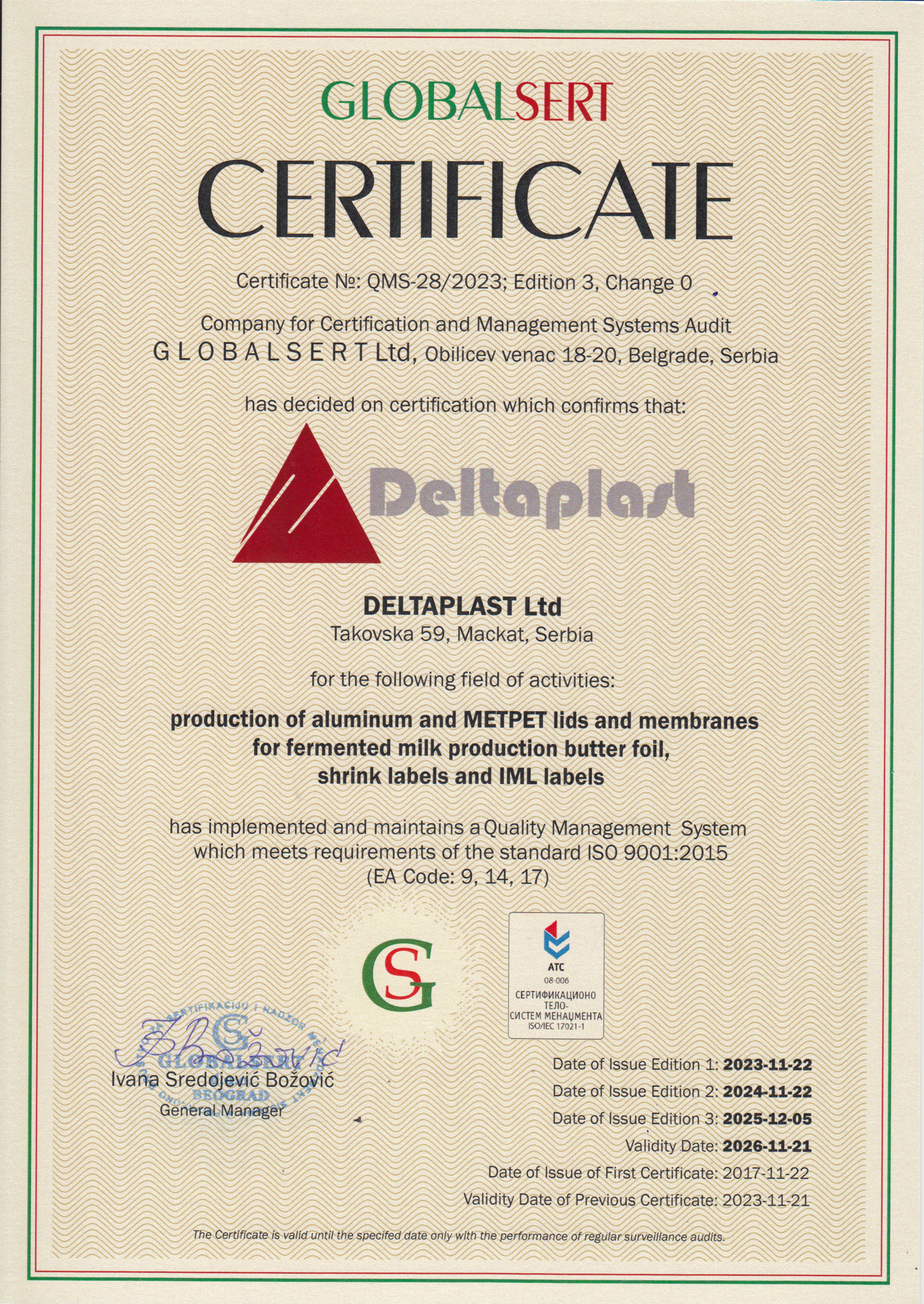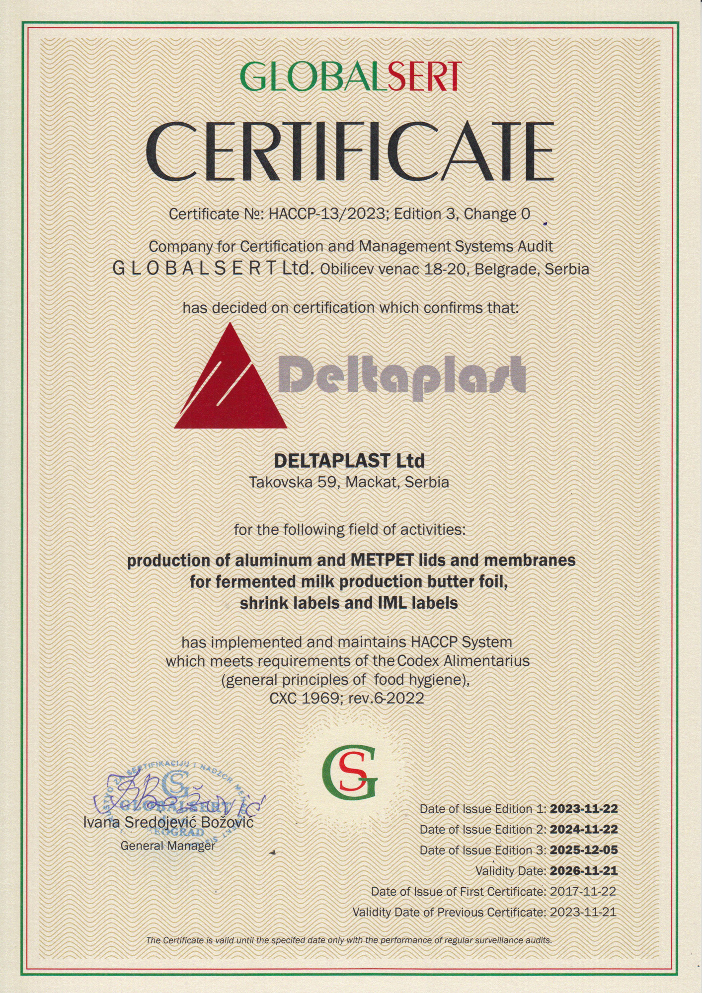Entering the new millennium, the company’s core business is the production of aluminum lids for a variety of dairy products. With state-of-the-art printing technology and hi tech stamping and bargaining machines, customers are offered attractive solutions and high quality aluminum packaging, manufactured in accordance with HACCAP and ISO standards and with laboratory-controlled materials.